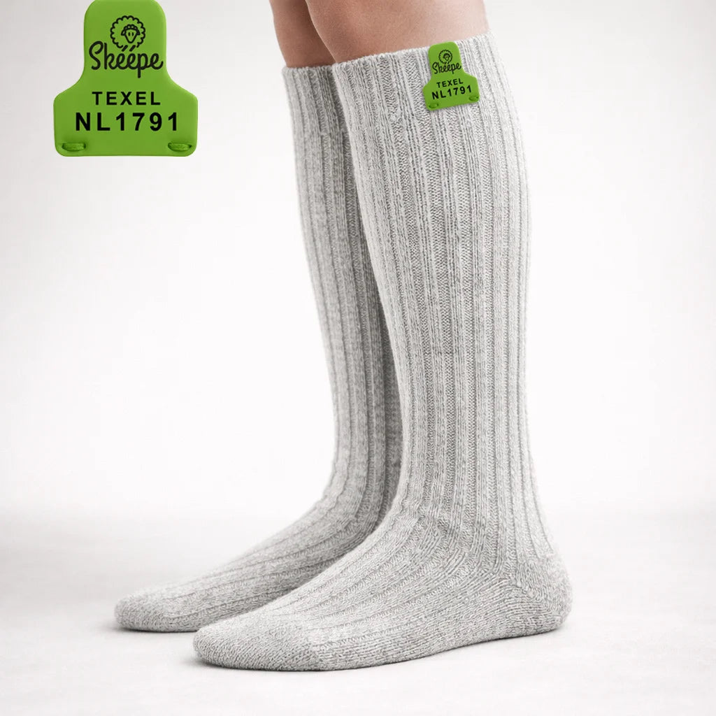 Lichtgrijze lange schapenwollen sokken met groen label Deze lichtgrijze lange schapenwollen sokken zijn gemaakt van wol van Texelse schapen. De... Lees meer