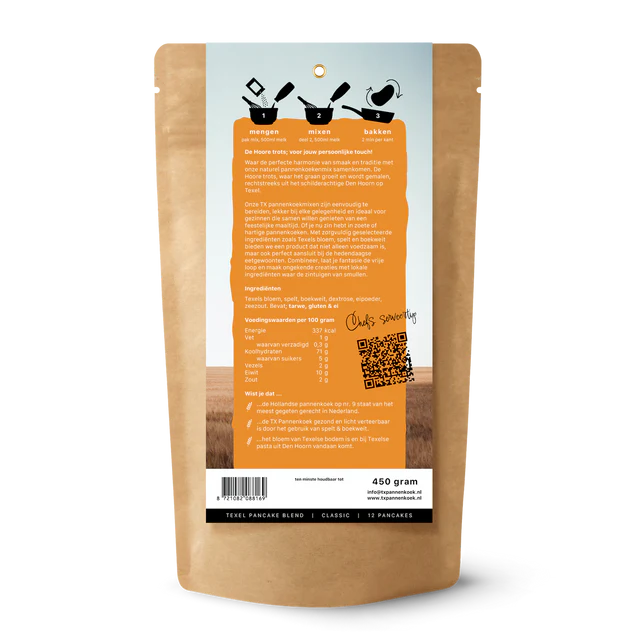 Texelse Pannenkoekenmix Naturel Deze pannenkoekenmix is ontwikkeld door chef-kok Robin Mosk en gemaakt met bloem van Texelse bodem. Het graan... Lees meer
