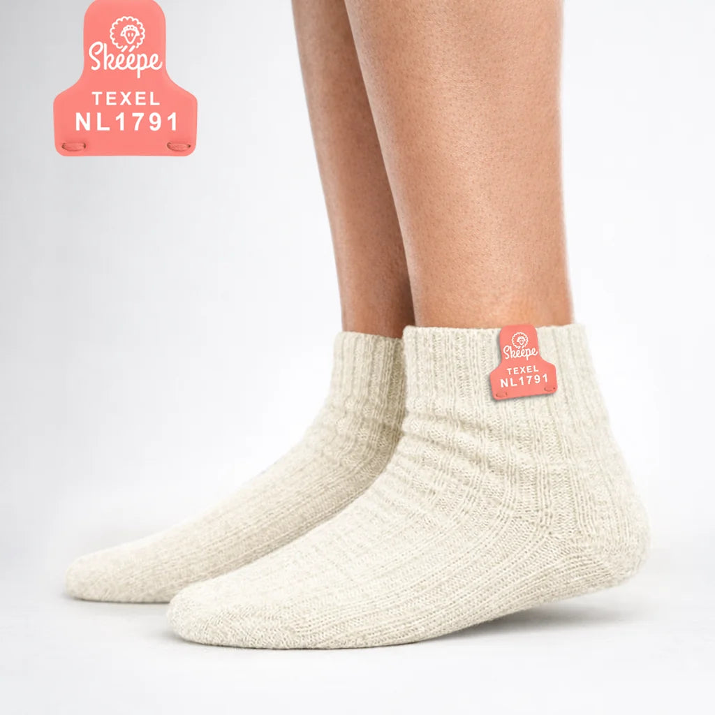 Korte schapenwollen sokken in wit met roze label Deze witte korte schapenwollen enkelsokken met roze label zijn gemaakt van wol... Lees meer